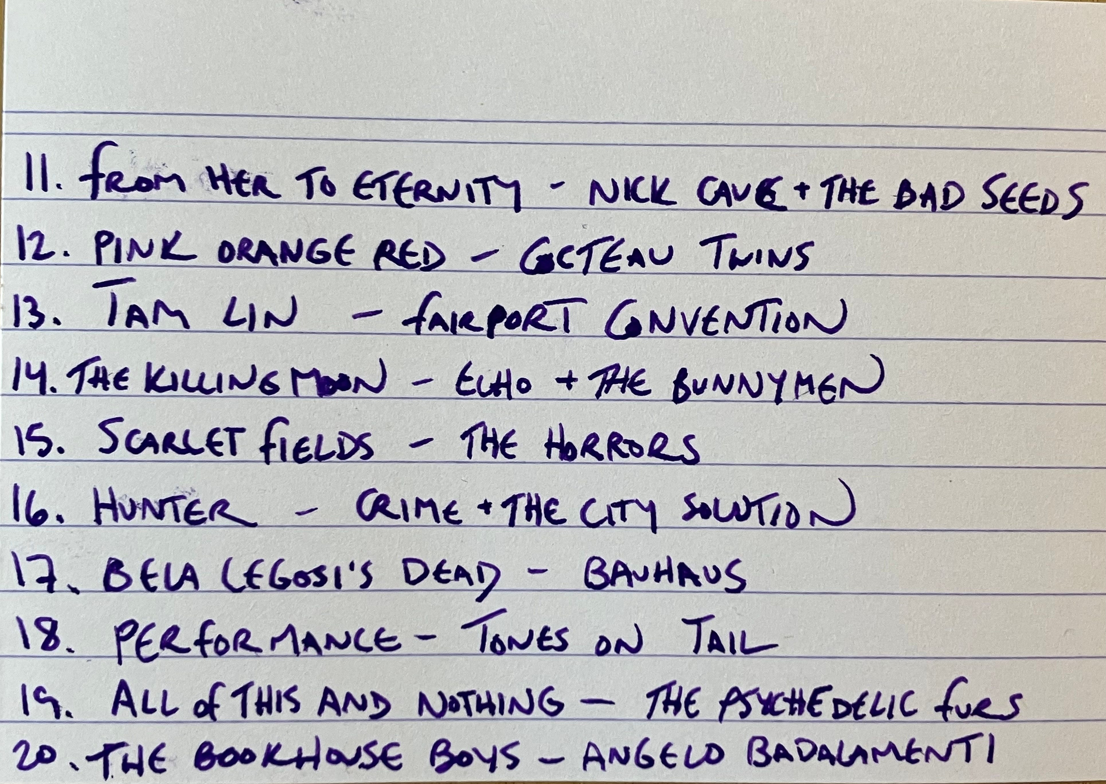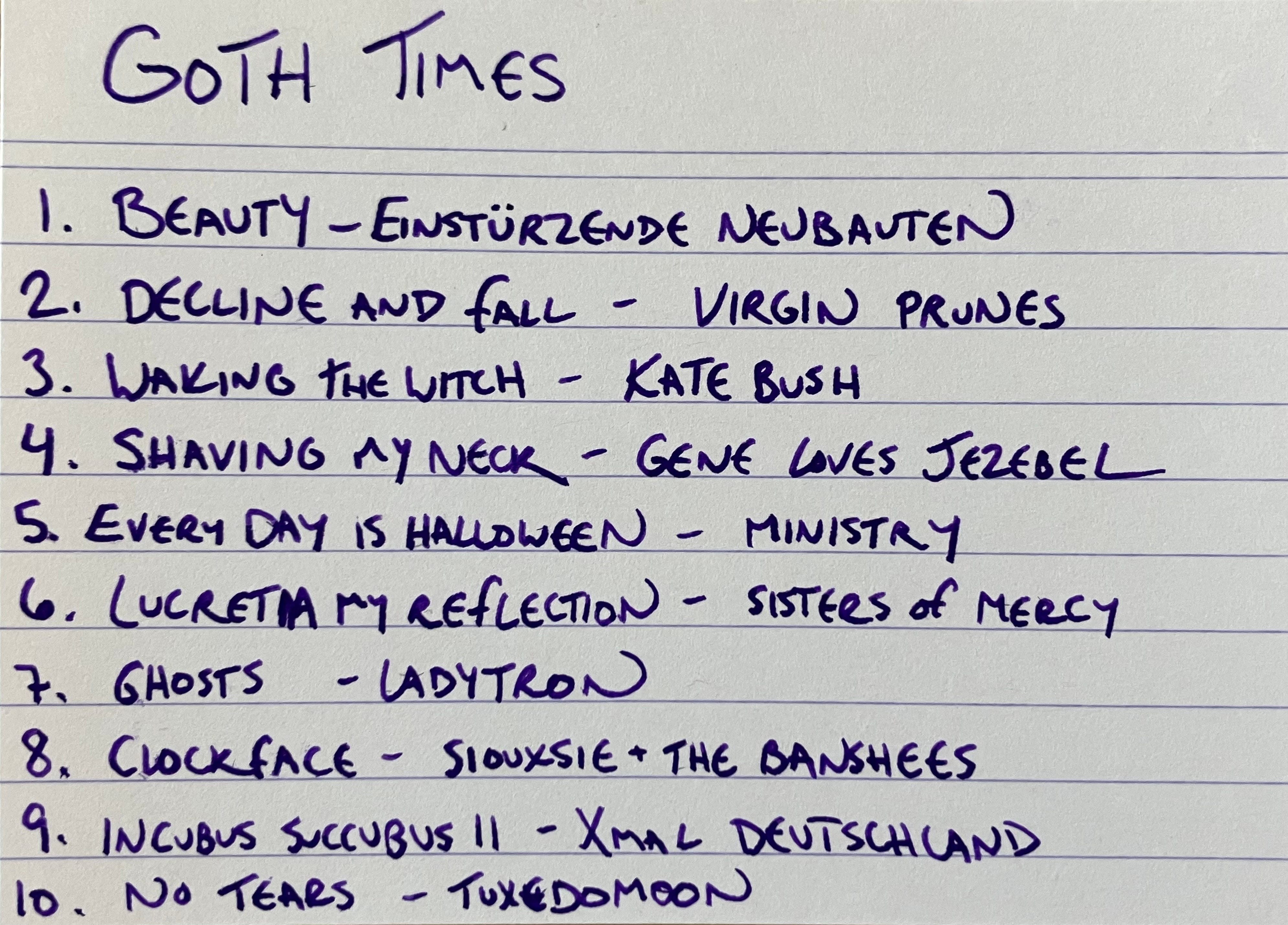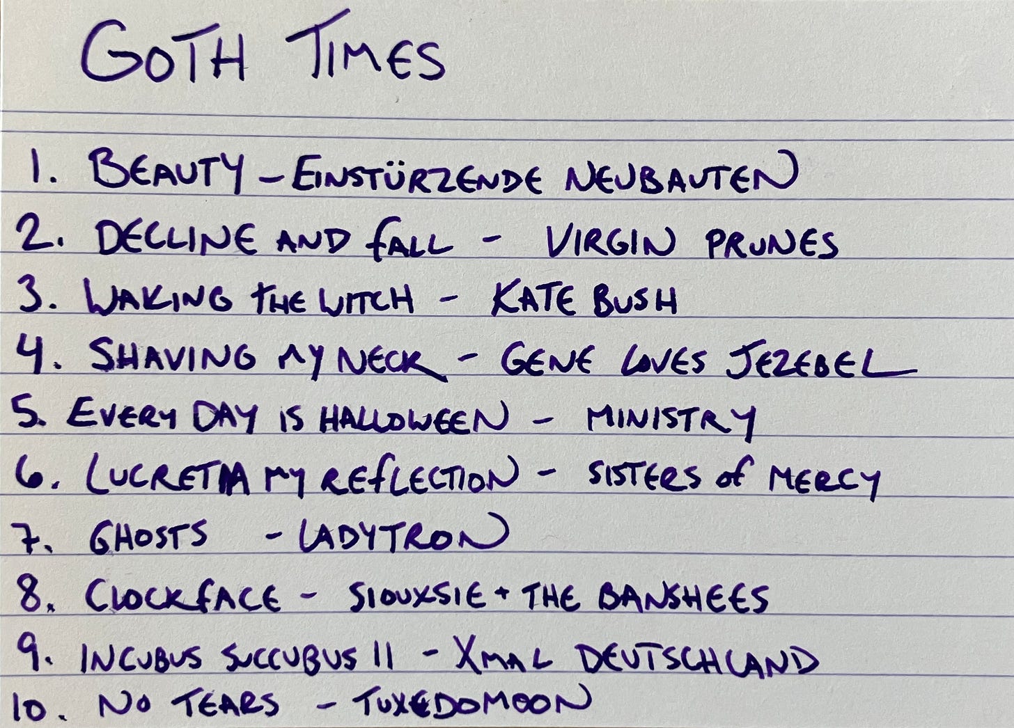 Creating a soundtrack fitting to this fleeting season has proven far harder than I expected. Too many glorious options to choose from. And putting so many intense, weird moods into an order with any kind of flow to it has taken ages. There were some brutal cuts (“Just one Virgin Prunes song? I can’t do it. I can’t!”). There were also some surprising last-minute additions. You’ll see a couple of goth classics, and some that aren’t goth per se, but were too witchy to keep out.