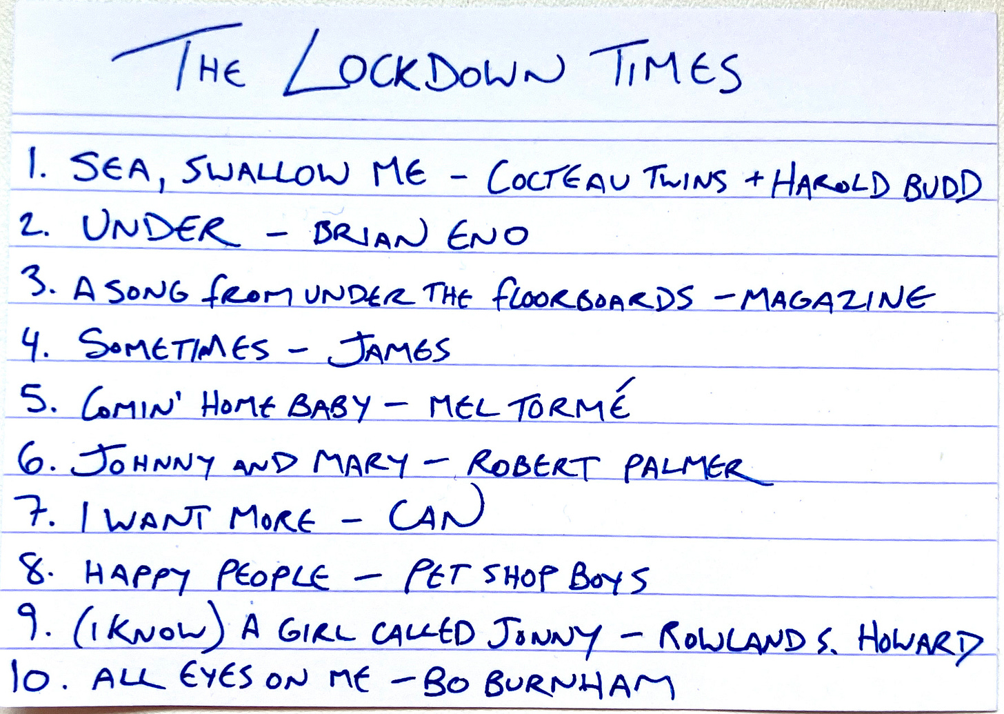 What songs remind you of the lockdown years? I would guess that, in isolation, people leaned into their idiosyncrasies in many ways, including musically, and I would love to know what music others found themselves leaning on in that strange, strange time.